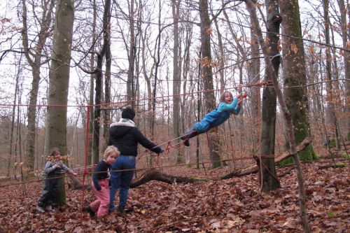 Die Zwergenhäuschen stehen noch alle und auch die Hüttchen (mehr oder weniger). Eine Schaukel und ein kleiner Seilparcours sind schnell gebaut. Die Kindergruppe hat sich schnell in mehrere kleine Grüppchen zerstreut. Ein Grüppchen testet die Seilaufbauten, ein Grüppchen pflegt die Zwergenlandschaften, ein paar Kinder schnitzen, sägen oder graben schon und ein Grüppchen streift auf Forschungsexpedition durchs Laub.